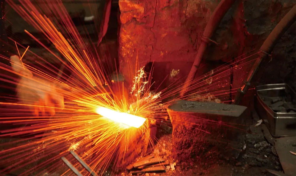 ほぼ全ての工程が職人の手仕事によって成り立っています。用いられているのは、真っ赤に熱した軟鉄や鋼を金槌などで叩き延ばして鍛える「鍛造」という技法。素材を叩くことで密度が増し、極上の切れ味と耐久性、そして美しさを生み出しています。