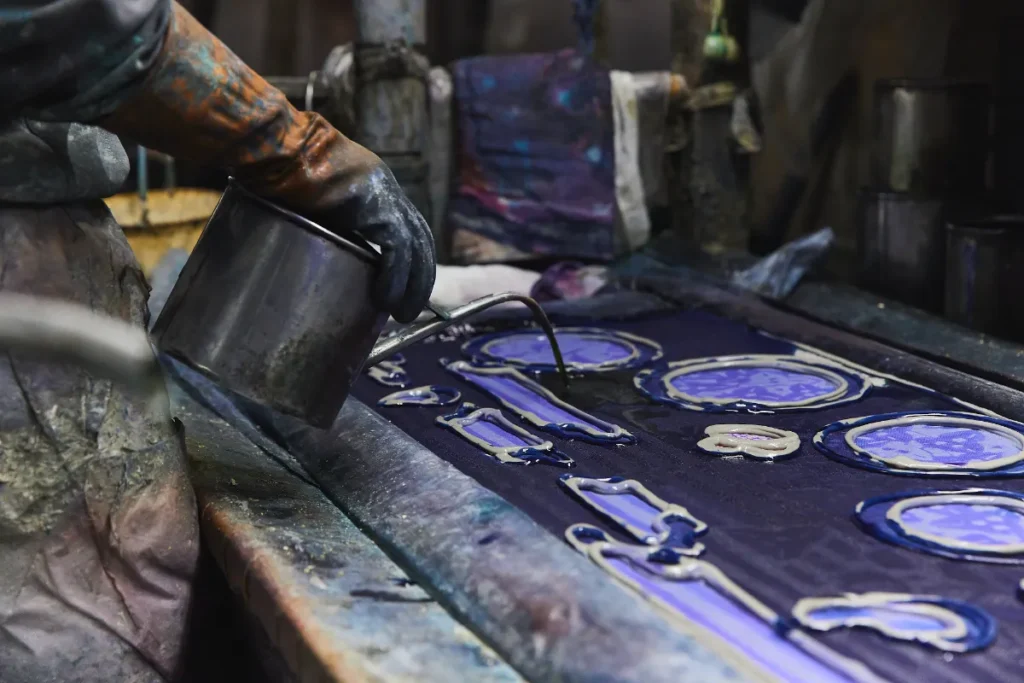 This is followed by an even application of a special ‘resist paste’ that can repel the dye. For each application, the fabric is folded in a bellows shape. This process, which greatly influences the subsequent steps, requires a considerable level of skill.
