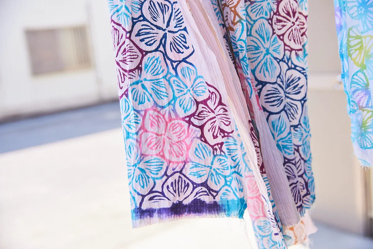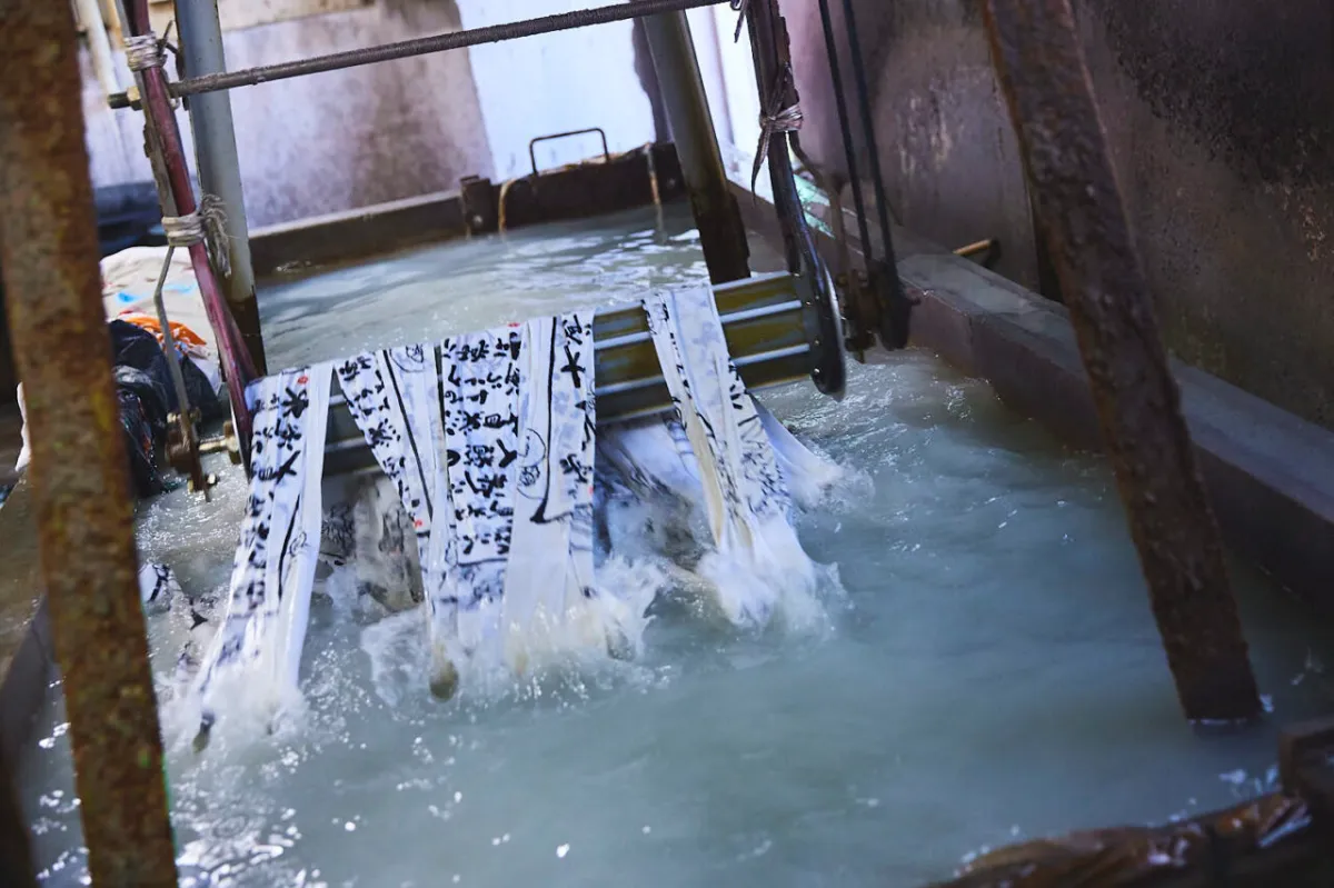 This technique is commonly applied to ‘wazarashi’, which is soft, skin-friendly fabric that underwent the process of removing impurities by bleaching. Wazarashi was designated as a national traditional craft under the name ‘Naniwa Honzome’ by the Minister of Economy, Trade and Industry in November 2019.