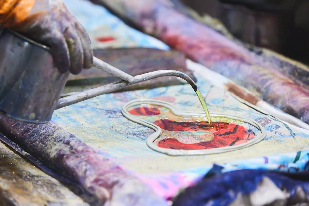 After placing the fabric with paste on the dyeing table, a sort of barrier (‘dote’) is formed by squeezing out the resist paste. This process prevents the dye from spilling over from the area enclosed by the barrier. Dye is poured into this space using a watering can-like tool (‘dohin’) and the fabric is dyed evenly by suctioning the dye from beneath the table with a pump. This process is repeated for the back side as well. The dye will not seep into the areas where the paste is applied while it will soak into the areas without it.