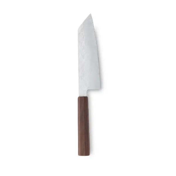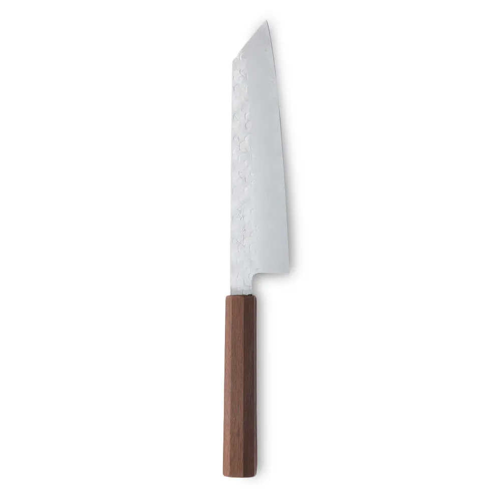 The blade’s striking contrast, reminiscent of a Japanese sword, is intentionally left with a rugged, hammered texture rather than being polished smooth, lending it a bold character. Meanwhile, the edges along the spine and heel—the parts of the blade closest to the handle—are carefully rounded for a comfortable grip. The warm walnut handle has a refined design that develops a rich patina over time, fostering a deeper connection as you use it.