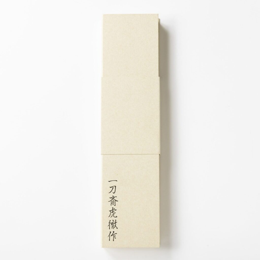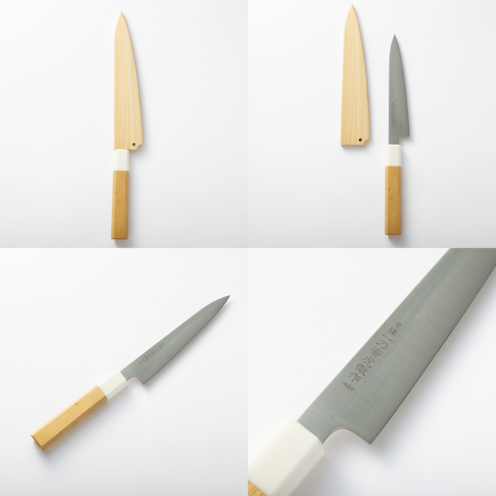第1回 一刀斎虎徹 INOX 和ペティ 青森ヒバ八角人工大理石口輪柄 青森ヒバ鞘付