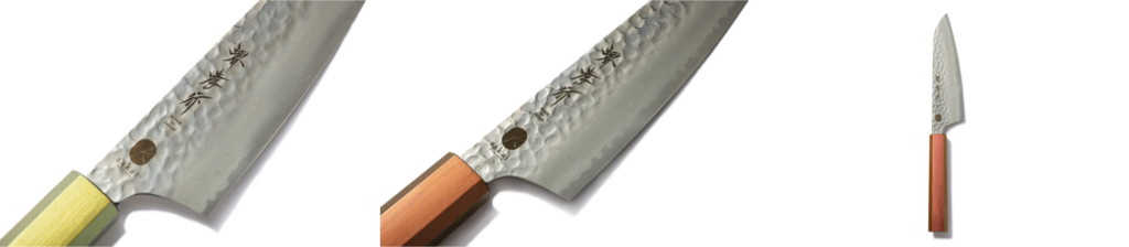 一般的にずんぐりとしたフォルムの三徳包丁を先を絞ったシャープなデザインにしたことで、スタイリッシュな印象をもたせました。また、刀身の表面に槌目(凹凸)を施すことにより見栄えがよくなり、さらに切刃のダマスカス模様が華やかさをプラスします。ダマスカスの美しい波模様はひとつとして同じものがないので、ぜひ1本1本見比べてお気に入りのものを見つけてください。