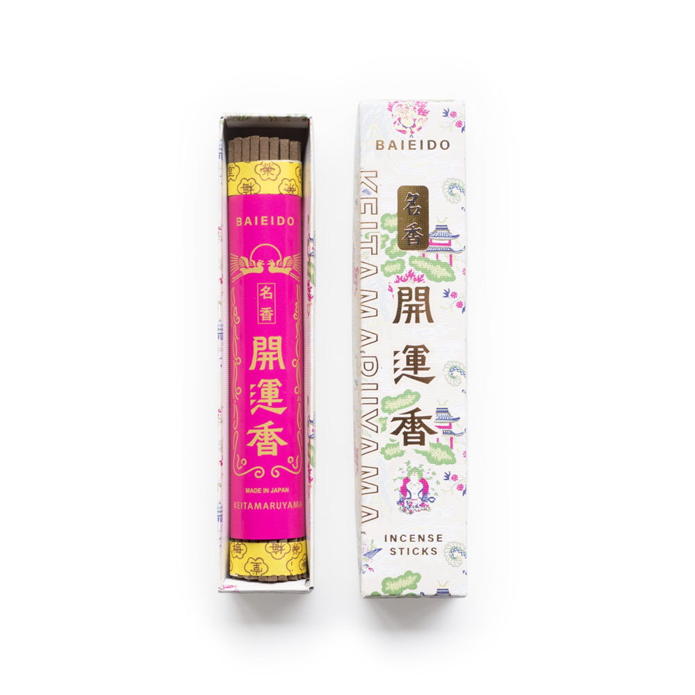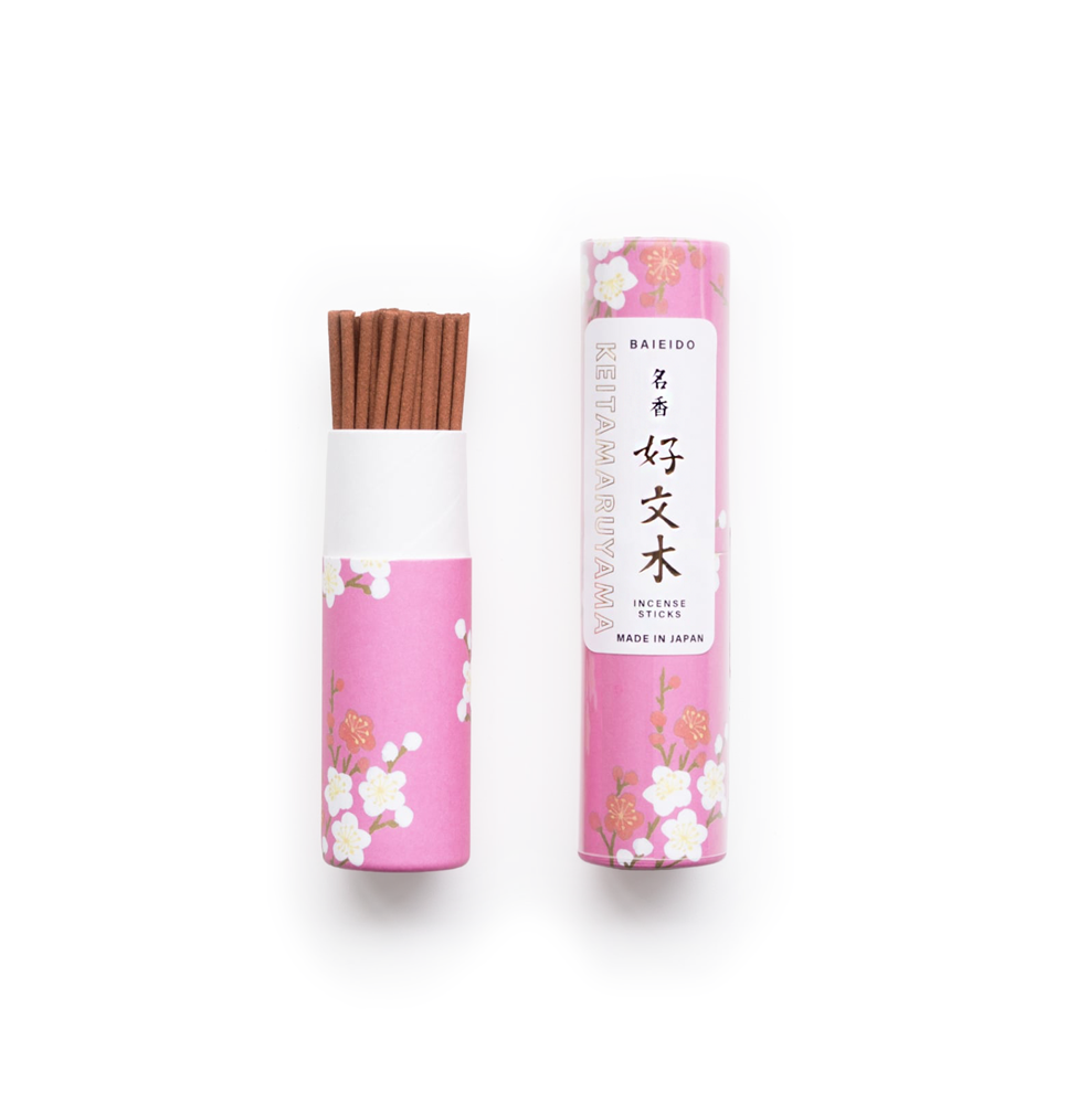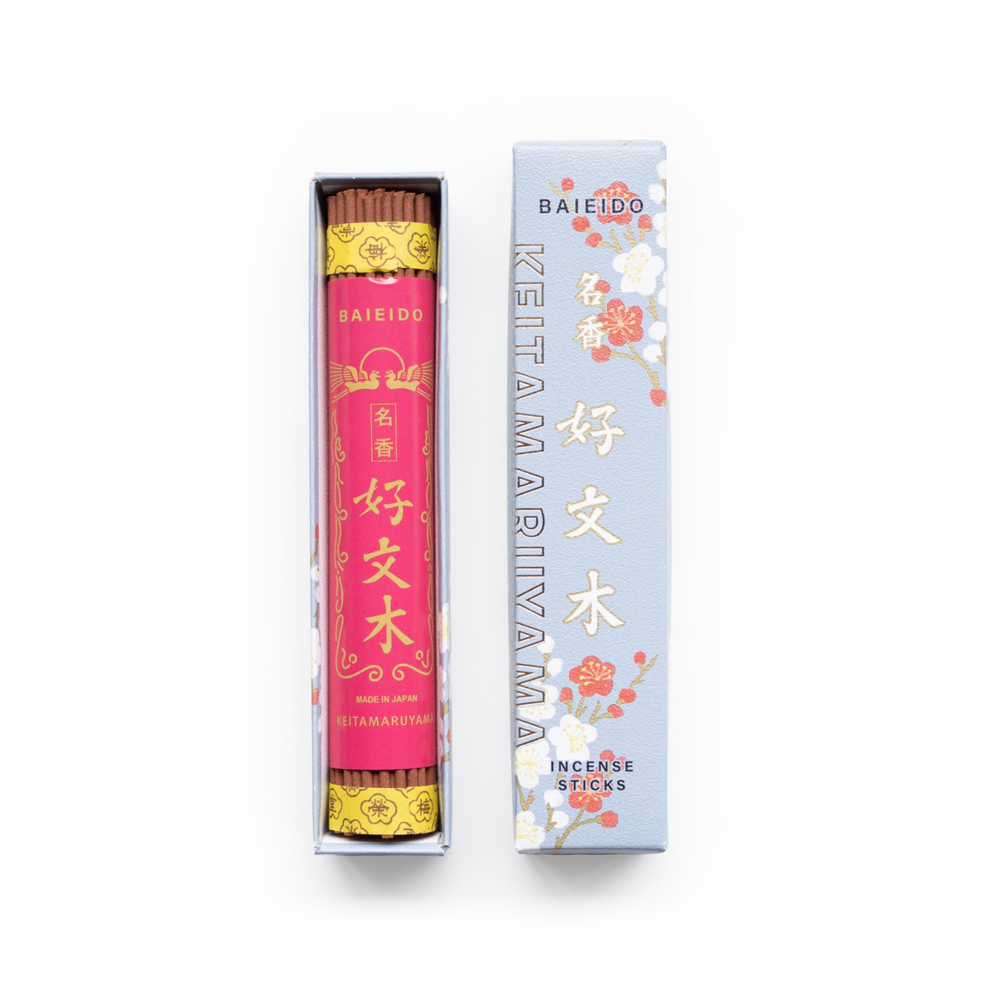 ラインナップは、梅栄堂を代表するロングセラー「好文木」「開運香」「白檀九重香」の3種類。それぞれ100年以上の歴史を持ち、厳選された天然原料を使用した深みのある香りが特徴です。好文木はやさしく華やかな香り、開運香は清涼感ある辛口の香り、白檀九重香は重厚で気品ある香りを楽しめます。