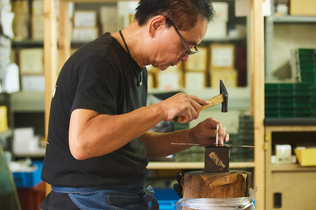 まずは、隆行さんによる「銘切り」。これは刃にブランド名を刻む工程です。金槌と鏨(たがね)を使い、小気味よく打ち込んでいく様子を眺めていると、簡単にこなしているように見えますが、細い文字をバランスよく刻むのは熟練の経験とセンスが不可欠です。