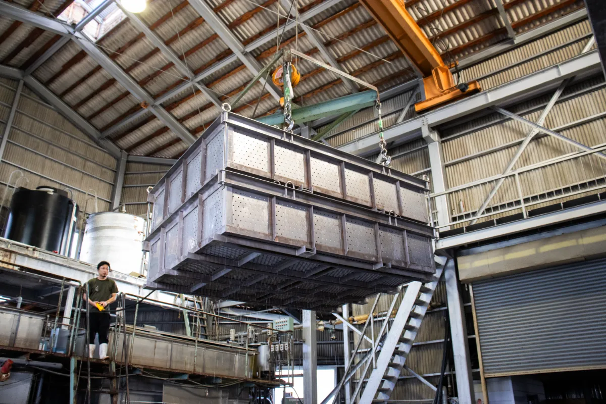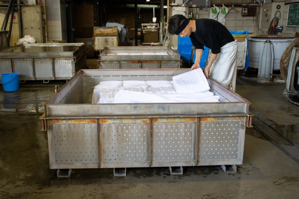 晒しの工程では、生地を大きな金属製のカゴに詰める作業があります。