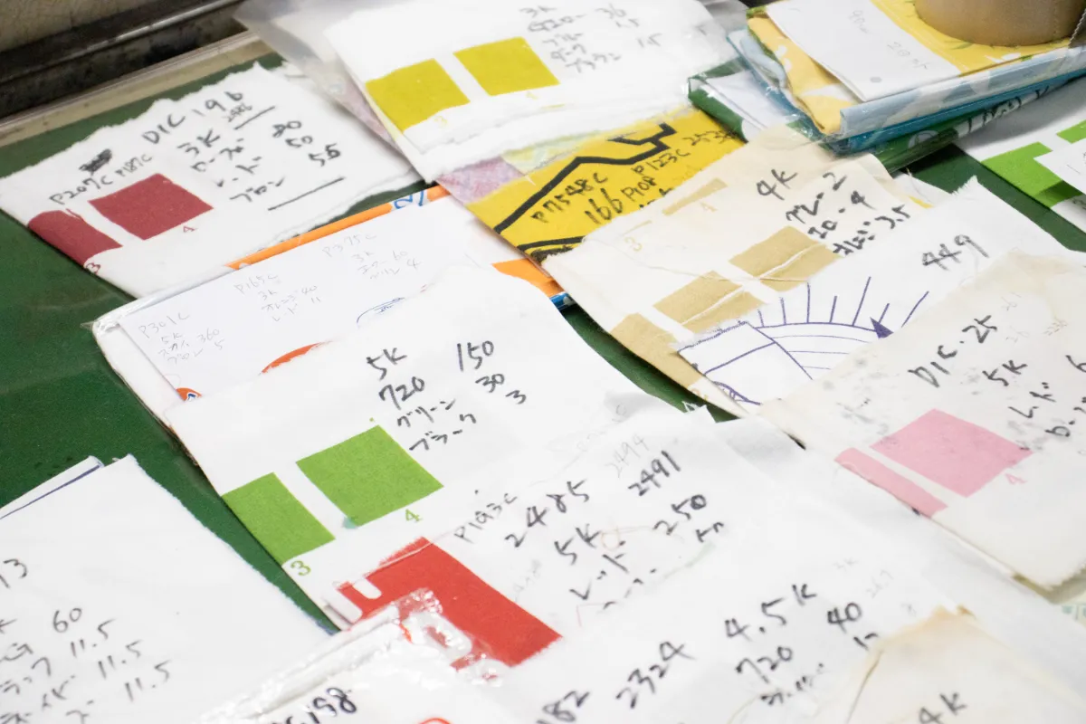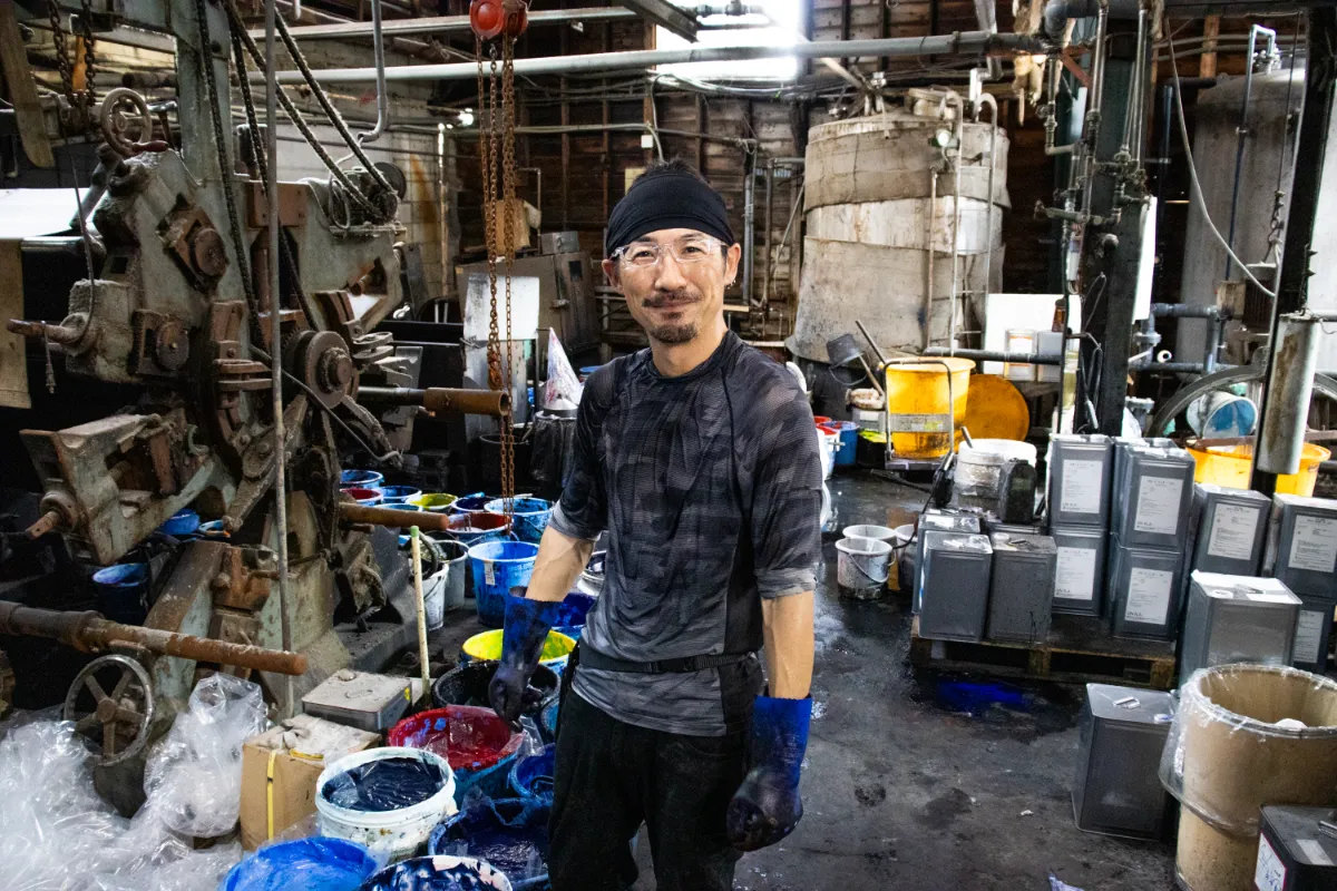 自社でスクリーン捺染を行っており、その調色・配合を一手に担うのが代表のお兄様で専務取締役の角野一晶さん。元歯科技工士という異色の経歴の持ち主で、独学で10年以上にわたり研究を重ねながら「角野の色」を生み出してきました。