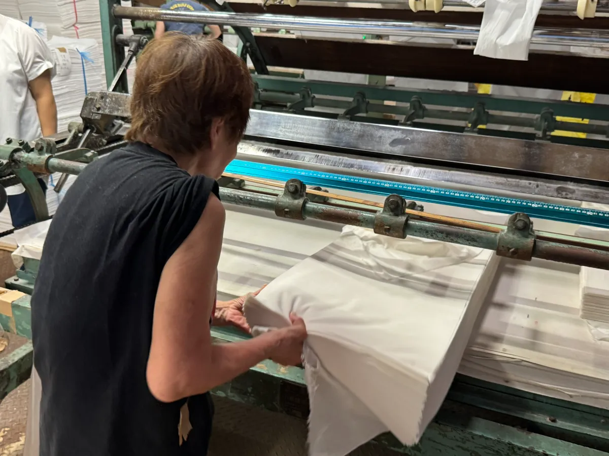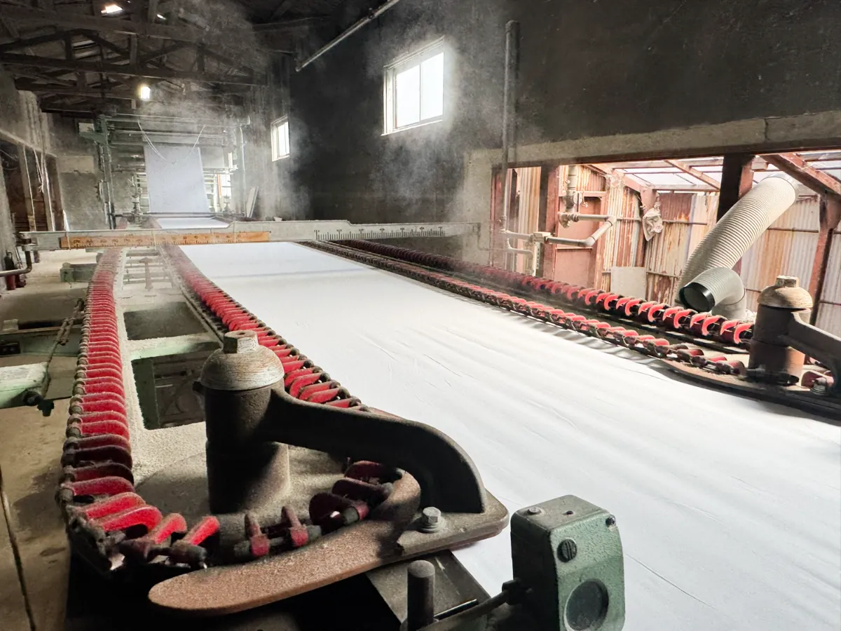 工場内でひときわ目を引くのは、晒し上がった生地を一定の幅に整えるテンダー(幅出し)機が力強く稼働する光景です。生地の端をクリップで掴み、蒸気で伸縮性を与えながら引き伸ばし、乾燥させ、最後は冷却によって幅を固定する―この一連の工程を担うテンダー機、武田晒工場は小幅と広幅の両方に対応できるものを導入しています。しかし、これらの機械は現在、日本国内ではほとんど製造されておらず、非常に希少な機械とのこと。日々丁寧なメンテナンスを重ね、大切に使い続けています。
